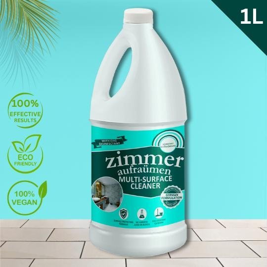 Zimmer Aufraumen Multi Hard Surface Cleaner Concentrate 1L is alkali based one shot bathroom & washroom cleaner, sanitizer and deodorizer. The antimicrobial agents present are highly effective in killing all types of bacteria, algae, mold, fungi and viruses which could possibly create stains, mal-odors and pose potential health hazards.