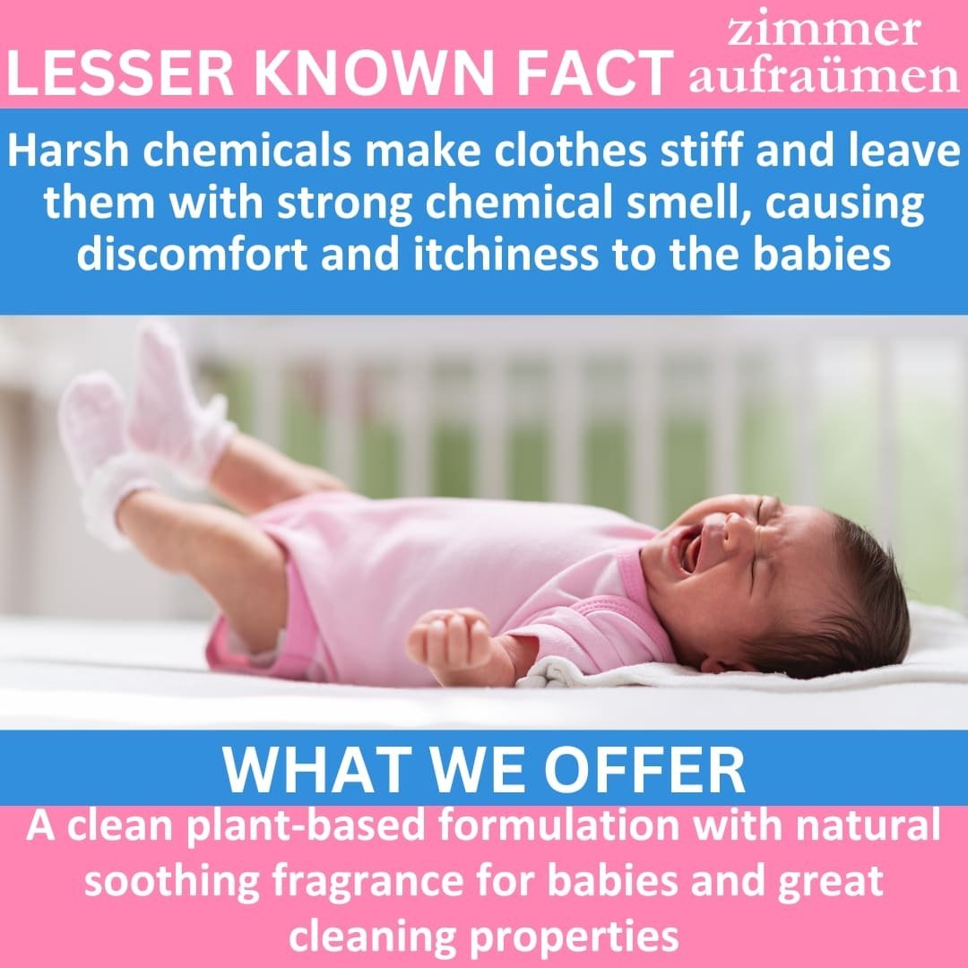 - SAFE FOR BABY. PLANTS BASED CHEMICALS: Zimmer Aufraumen Baby Laundry Wash Detergent is made of Coconut Oil & Sugar Cane Derived Surfactant, having excellent cleaning properties and completely harmless, biodegradable, and the environment safe.