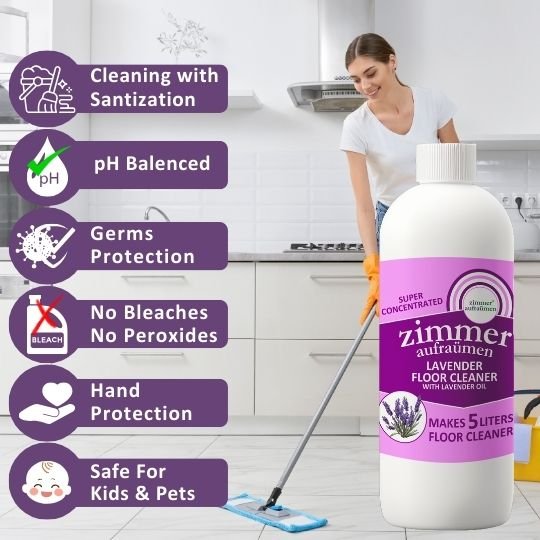 Zimmer Aufraumen Floor Cleaner Citrus Lemon removes dust, and geese from the floor and tiles and makes sure it has a germ-free surface for at least 12 hours.